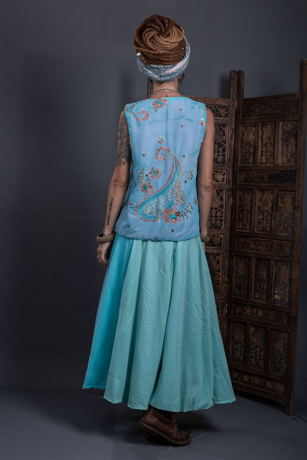 Traditional Indian organza sari is the epitome of oriental extravaganza! It is all sparcles and hues and shimmers, sometimes even too much. To "dimmer the shimmer", we add pastel mesh on top of our organza sari skirts, making them softer, more voluminous, and absolutely breathtaking in color. The original embroidered organza textiles that we use are one-of-a-kind vintage saris that were acquired at Goa flee markets in the heat of the season, when all the best treasures from the trunks of neighboring states are coming to local hippie bazaars.
