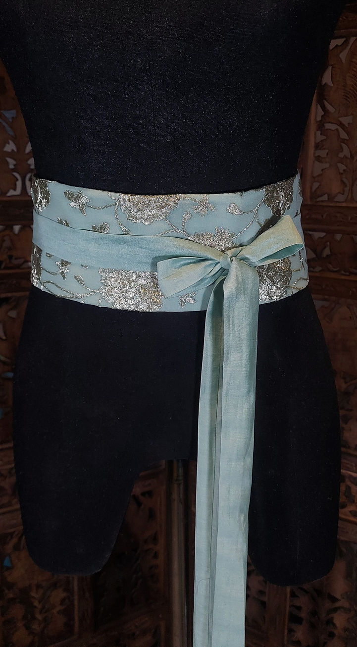 Traditional japanese obi belt made with heritage indian fabrics. For lining we use pure chanderi silk, and for the outer layer - baranasi zari brocade, certified handwoven fabrics from Banaras (Varanasi) - a city with 1000 years old history. Our supplier Shivangi Kasliwal is well known in India. This fabric is made by original baranasi masters, working with brocades for generations. Shivangi been reviving this heritage craft for the past 12 years, and we fully support this mission. Gorgeous belt can be worn with dresses, skirts or kimonos to add stuning accent.